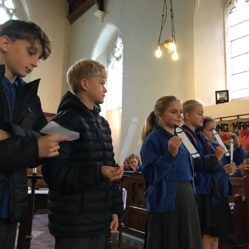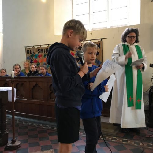 At our Harvest Service, we presented a collection for the DENS foodbank. We also heard about this year's St Albans Bishops' Appeal - Rewrite Their Future - which aims to provide classrooms and school resources for children in Uganda and Zambia. Children from Class 5 shared prayers they had written having learnt about the appeal.