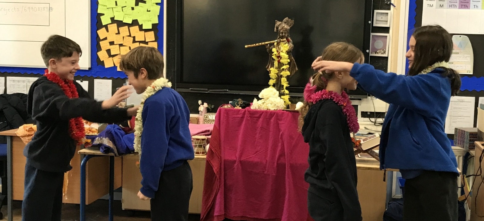 KS2 classes were visited by Krishna from the Hare Krishna Temple in Watford. She led us through some different aspects of Hinduism to launch our learning in RE this half term. The children learnt about the Namaste greeting, Hindu beliefs about God, the soul and karma, and the story of Rama and Sita.
